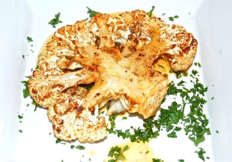 Serves 2 A CookTale The crisper drawer in the fridge contained a Cauliflower, It was use it tonight or forget about it. It turned out to be a good side dish to our Chicken Thighs and Sauteed Spinach dinner. The addition of Pimenton Paprika added another dimension of flavor to the Cauliflower. It was an experiment that worked. INGREDIENTS 1 Head of Cauliflower, cut verically into 3/4″ slices METHOD 1. Heat the oven to 425F. |