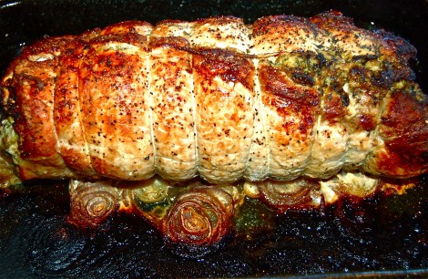 A CookTale My first brave attempt at preparing a Porchetta. It was a step by step “learn by doing” experience. The procedure was more threatening than it actually turned out to be. Preparing the stuffing was a bit time consuming, but a very necessary step. INGREDIENTS 2 TB OF EVOO 1 5-pound boned Pork Loin or Pork Shoulder Roast, with the belly and skin attached