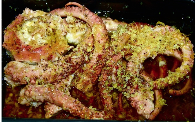 In countries that border the shoreline of the Mediterranean, Octopus is a popular and well liked delicacy. One would never know it, as I watched a fisherman in the Algarve, the most southern shoreline of Portugal, pound and slam one against a rock for at least fifteen minutes in the long held technique of tenderizing the meat. Fortunately for the Octopus that procedure did not cross from the “old country”. There are specific rules that dictate how an Octopus should be tenderized. For me, If it’s less than 4 pounds, after boiling to a state of tenderness, simply marinate in a mixture of EVOO, lemon juice & seasonings. I would not suggest outdoor grilling.