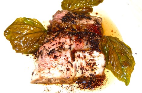 Once again we enjoyed the wonderful offerings from Heather Ridge Farm in Preston Hollow, NY. Their pigs are pasture raised, plus their food supply is supplemented with a corn soy mineral mixture. To add to their tenderness they’re harvested at 5 to 6 months. The result of all this special care is that the pork and all the livestock are treated well and taste is the evidence. Carol Clement and her husband are the farmer/owners, a major undertaking with amazing results. I asked her this morning, “with hurricane Irene on the way tomorrow, how do you protect the animals?” Her response was much too long to report, but it was formidable. INGREDIENTS 1 Rib Pork Chop, 1-1/4 pound + 1″ thick (for hearty eaters METHOD 1. Heat the oven to 375 degrees. 5. If using, add the Basil Leaves to the hot oil for a few minutes, then remove.