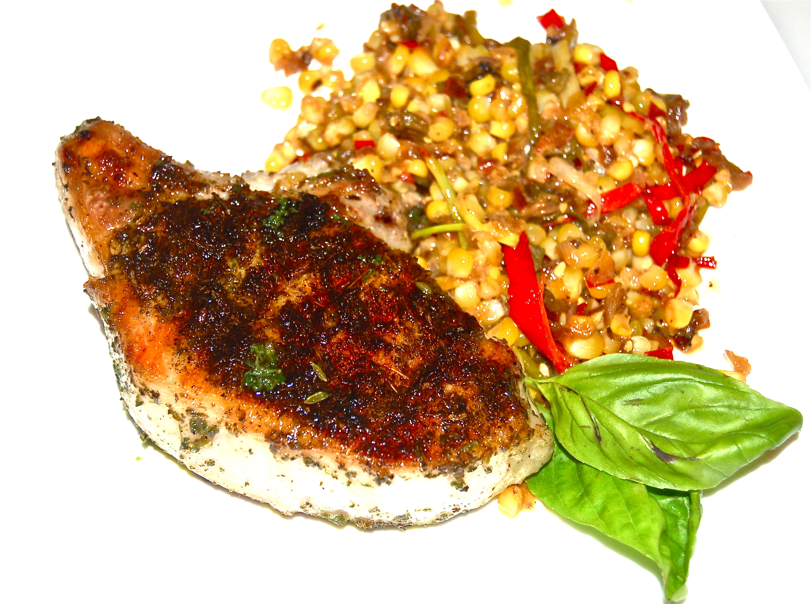 Fred Brill, the Manager of Adam’s FairAcre Farm’s superb meat department, had four great looking rib pork chops, waiting for Cathie’s arrival. Each was one inch thick, (as requested) and as fresh looking as if they just left the cutting room, which I’m sure they did. To accompany the evening’s plate, I (as I usually do on Saturday’s) headed for the Saugerties Farmers Market and stocked up on corn, poblano chiles, heirloom tomatoes, and the freshest green beans picked that morning.