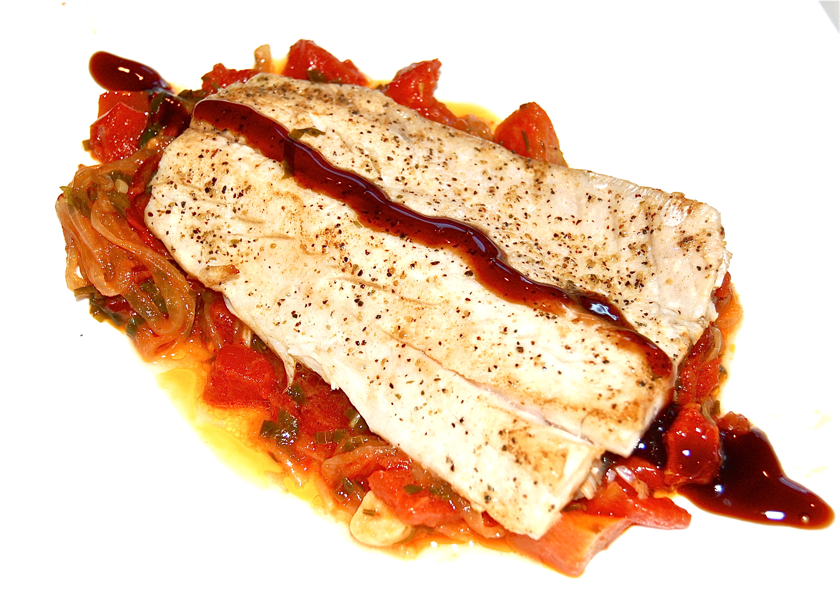3. Just before the fillets are ready, taste the Piperade & adjust the seasoning if necessary. Spoon the sauce onto the center of individual plates.