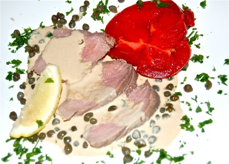 Once or possibly twice a year we yearn for Veal with Tuna sauce, Vitello Tonnato. A call to Fred Brill at Adam’s Fairacre Farm seeking his advice on the proper cut of Veal resulted in his recommending Top Round. His opinion was validated by any number of food writers, incuding Marcella Hazan and Saveur Magazine amongst others. This is a typical Summer dish in the Lombardy and Piedmont regions of Italy. So it is in Woodstock.