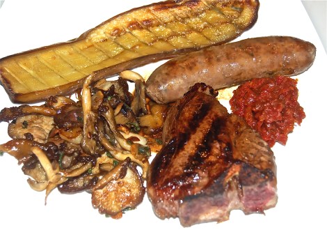 So into the freezer we searched and came out with Loin Lamb Chops and Merguez Lamb Sausage. We had on hand fresh Shiitake and Oyster Mushrooms and Japanese Eggplant. A very easy-to-prepare dinner. The Lamb in a grill pan, the Mushrooms in a saute pan, and the Eggplant in the oven. The Tomato Jam made two days ago, came right out of the jar.