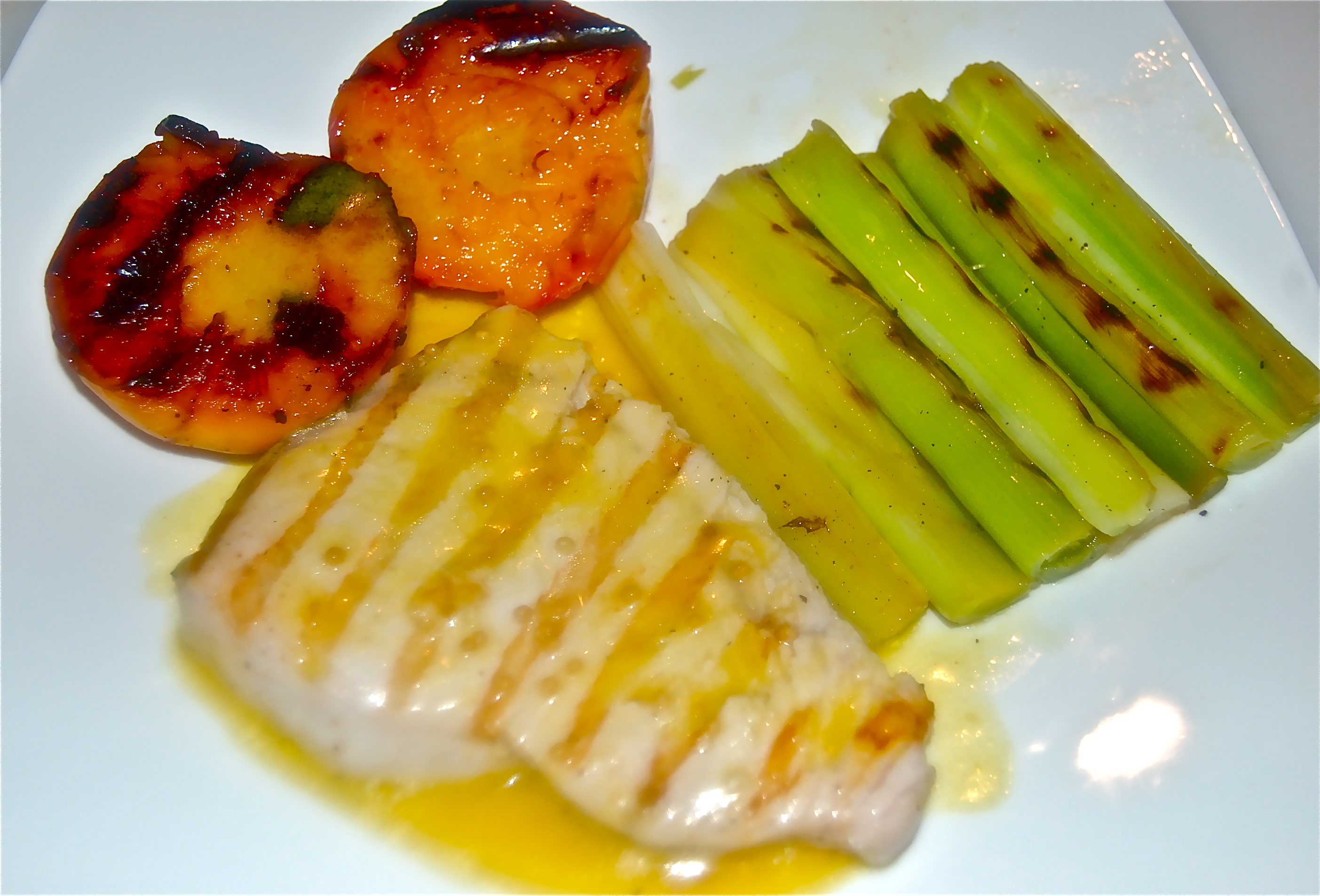 How often have I praised Mario Batali? I can’t count the times. I was about to prepare his recipe for Swordfish with Leeks and Grapefruit, but there was no Grapefruit. I did have lovely Swordfish from Adam’s Fairacre Farm, a dozen young Leeks, purchased at the Saugerties Farmers Market (from a farmer named Jacob of Deep Roots Farm), and Peaches.
