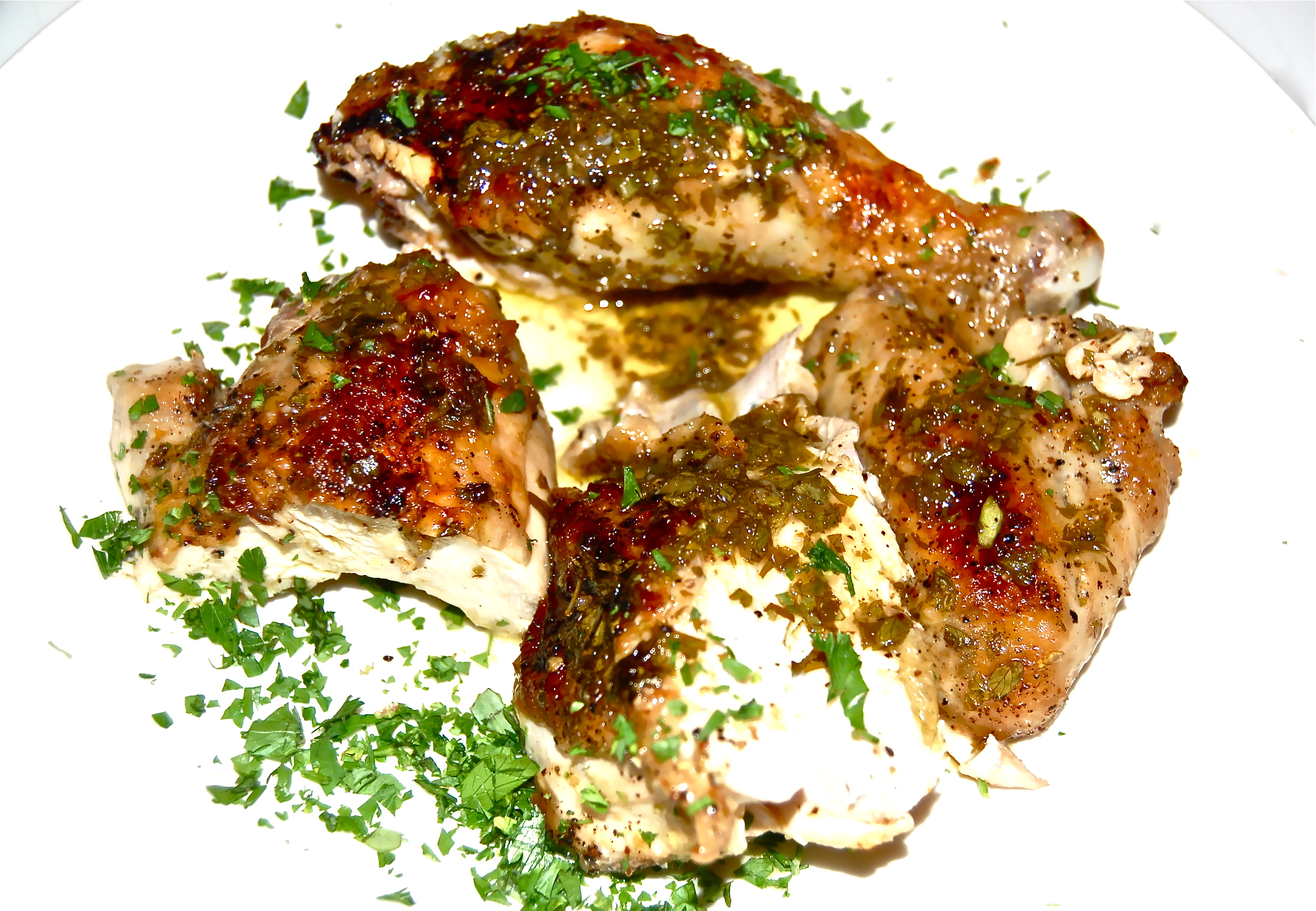 My adaptation of Rao’s Lemon Chicken Serves 2 A CookTale Of the many outstanding dishes served at Rao’s on East 114th Street in New York, I would venture a guess that Lemon Chicken stands out in people’s minds as the one most associated with the restaurant. Yet the one time Cathie and I had dinner there, I remember ordering Broccoli Rabe with Orchiette and Veal Marsala. At home in New York City I occasionally attempted to cook Lemon Chicken, generally unsuccessfully. Last evening with an organic, free range bird from Heather Ridge Farm, I finally rated one star from Cathie, my most critical critic and taster. INGREDIENTS 1 3 Pound Chicken, halved METHOD For the Chicken 1. Preheat broiler at least 15 minutes. Broil Chicken halves, turning once, for about 25 minutes or until skin is golden-brown & the juices run clear when pierced with a fork. (Do not over broil; the broiled Chicken goes back in the broiler for 3 minutes more.) 2. Remove the Chicken from the broiler (leaving the broiler on). Using a very sharp knife, cut each half into 6 pieces (legs, thighs, wings & breast pieces). 3. Place the broiled Chicken parts in a large bowl & pour 2 TB of Lemon Sauce over the Chicken. Gently toss to coat. They can be left to marinate until you’re ready to complete the dish. 4. Add the Chicken parts to a deep sided baking sheet, return the Chicken to the broiler & broil for 2 minutes. Turn each piece and broil for an additional minute. 5. Remove from broiler & divide the Chicken onto 2 plates. Pour the Lemon Sauce into a heavy saucepan. Heat gently. Stir in the Butter & the Parsley. Pour an equal amount of the enriched Sauce over each plate & serve LEMON SAUCE METHOD Whisk together Juice, Oil, Vinegar, Garlic, Oregano, and Salt & Pepper. Cover and refrigerate until ready to use. Whisk or shake vigorously before using. Li