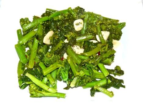 INGREDIENTS 1 lb of Broccoli Rabe. METHOD 1. Wash Broccoli Rabe, trim the stems, remove & save large leaves 2. Steam for 6 minutes, flush in cold water and drain. Cut into small pieces. Set aside. 3. Add the EVOO to a deep sided frying pan, when rippling hot saute Garlic & Red Pepper flakes, do not let them burn. Add the Broccoli Rabe. Toss it all together & cook until the mixture is softened to taste. Add a few ounces of water if the pan gets too dry. |