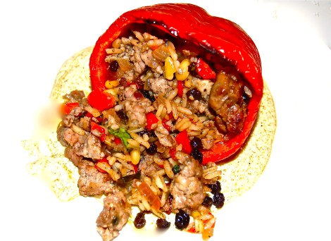 Serves 2 A CookTale Our dinner was inspired by a recipe in the New York Times by Florence Fabricant. The minute I saw it I knew that one day it would be some evening’s dinner. And last evening it was. All of the ingredients, except the Andouille Sausage, were in our fridge or in the pantry. After one hour in the oven, plated with a Cumin Yogurt Sauce, accompanied by a salad of Romaine Lettuce tossed with a Mustard Vinaigrette, we enjoyed a delicious and different Sunday dinner. INGREDIENTS 2 Red Bell Peppers (of equal size) METHOD 1. Heat the oven to 350 degrees. 2. Slice the tops off the Red Peppers, & chop the tops into a fine dice. 3. Heat the 2 TB of EVOO in a large saute pan & saute the chopped Pepper with the chopped Onion on a low flame, until soft & starting to color. 4. In a small sauce pan add 3/4 of a cup of Water, bring to a boil & add the 1/2 cup of Rice. Simmer for 10 minutes or until the Water evaporates. Stir the cooked Rice into the large saute pan, add the toasted Pine Nuts, the Currants, & 1 tsp of Cumin. Saute until heated through. Add the chiffonade of Mint. Season with the Salt & Pepper, toss & add the 1/3 cup of Marsala or Vermouth. Set the stuffing mixture aside in a large bowl. 5. In the same saute pan add the 1 remaining TB of EVOO & add the Andouille Sausage meat. Cook until it loses its raw color & begins to brown. Add it to the large bowl & blend the stuffing all together. 6. Fill the 2 Peppers with the stuffing, do not pack them too tightly. Top them with a 1/8 thick slice of Lemon. Stand them in an oven proof baking dish, add 1 TB of EVOO & 1/4 cup of Water to the dish. Bake for 1 hour. 7. Whisk together the remaining 1 tsp of Cumin with the cup of Yogurt & 1/4 cup of Lemon Juice. 8. Put a puddle of sauce on the plate, cooked Peppers on top, and serve. |
