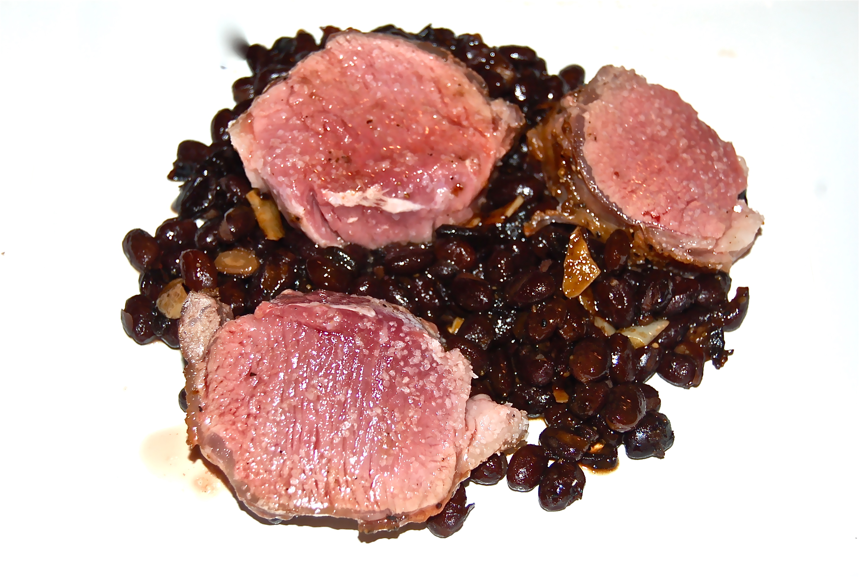 Serves 2 A CookTale As long as fifteen years ago, in La Cucina Italiana a magazine devoted to the cuisines of the twenty regions of Italy featured this recipe. Over time I’d occasionally take a stab at it and success was generally based on the quality of the Loin of Lamb. Yesterday I decided to try again, I pushed through the door of The Smokehouse Of The Catskills, and with doubt in my voice, asked Mike, “do you carry Loin of Lamb”. Without blinking an eye he’s in the fridge and returns with a fresh, still wrapped in its casing, Loin of Lamb. “How much do you need”. I departed with a beautifully prepared 1-1/4 pound of Loin blanketed in a sheath of its fat for proper searing before roasting. If awards were given for Loin of Lamb, this would have won 1st prize, hands down. INGREDIENTS 1-1/4 LB of Boneless Loin of Lamb (wrapped in a layer of its fat, for searing) METHOD 1. Season the Lamb with the Salt & Pepper. In a cast iron pan warm the EVOO over high heat. Add the Lamb & sear it on all sides until it’s quite browned. Remove the Lamb in the pan & set aside. 2. Heat the oven to 400 degrees, add the pan & roast for about 5 to 6 minutes or until the internal temperature of the meat registers 120 degrees, for rare. For medium rare continue to roast for a few minutes. The Lamb must be pink & juicy. 3. Remove the pan from the oven & place the Lamb on a platter. allow the Lamb to resettle & cover to keep warm. 4. In a small sauce pan bring the 1/2 cup of Water to a boil, reduce it to a simmer & add the Demi Glace. Whisk until completely dissolved. 5. To the hot pan with their cooking juices, add the Wine, the Garlic & half the drained Beans. Simmer for about 5 to7 minutes season with the Salt & Pepper & add the enriched stock. 6. Remove the layer of fat wrapped around the meat, revealing the Loin of Lamb. Slice it into 1-1/2″ medallions. 7. To serve, add the Black Beans to the two plates & top with the medallions of Lamb. |