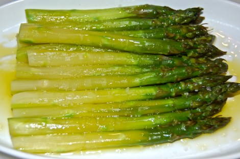 Serves 2 INGREDIENTS 1 LB of Asparagus (Spears peeled & 1″ of the bottoms removed) METHOD 1. Bring a deep sided pan of Water to a boil. Add the Butter & a pinch of Salt. Reduce to a simmer & add the Asparagus. Cook for 4 to 5 minutes, depending on the thickness of the spears. 2. Remove & drain on paper towels. Add to a serving dish & douse with the EVOO & the Salt & Pepper. |
