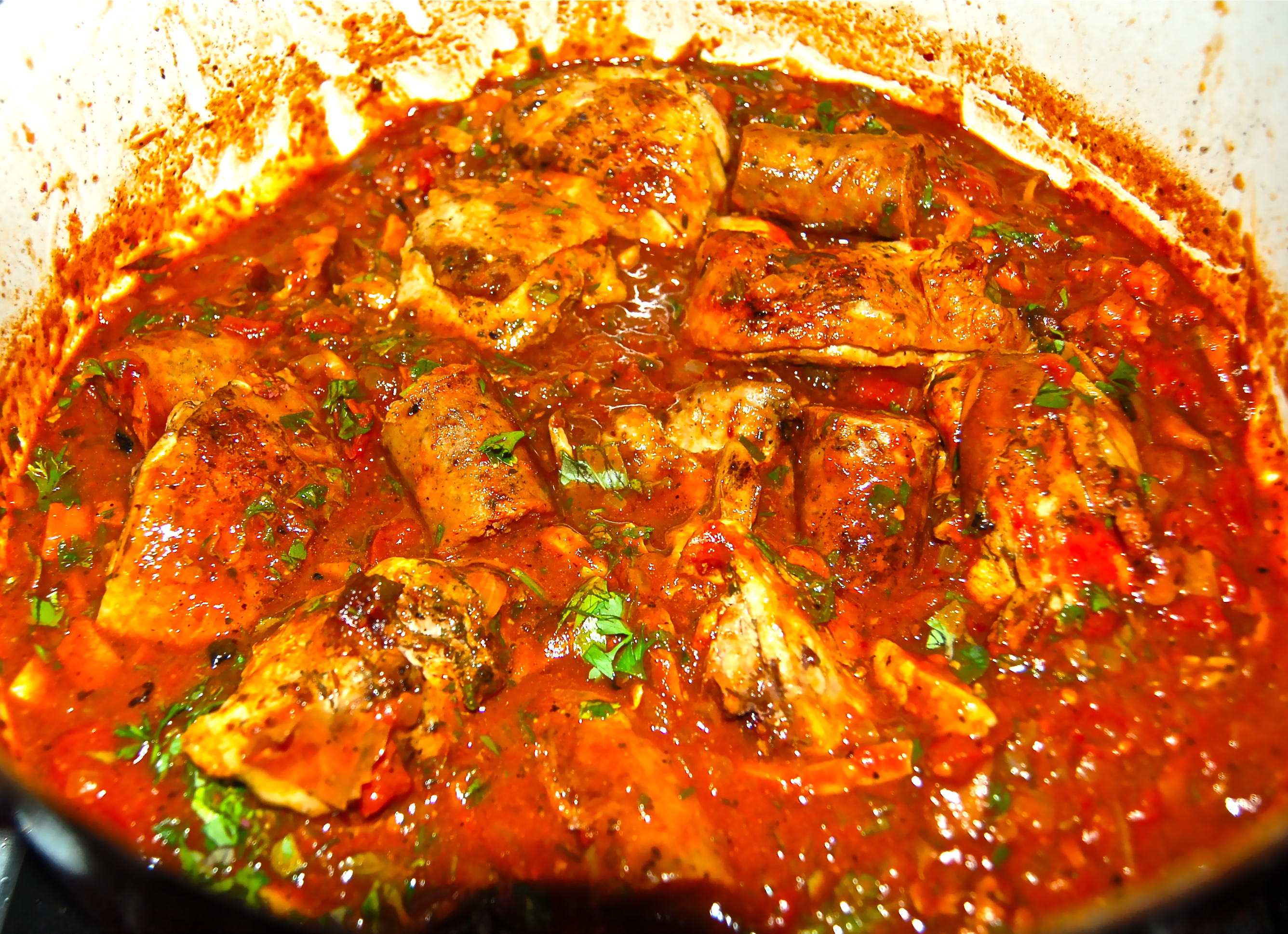 A CookTale When I run out of ideas as to what to do with Chicken Thighs, a savory stew like Chicken Cacciatore continues to work for me. And of all the recipes for Chicken Cacciatore (Google lists over 800,000), Mario Batali’s Chicken Hunter Style, which dates back to 2000, is my old reliable. My adaptation has the audacity to make changes in Signore Mario’s recipe. But when eaten, it all seems to work out. INGREDIENTS 5 Chicken Thighs 8 Ounces each (bone in, skin on) METHOD 1. Cut the Chicken Thighs into 10 pieces. 2. Combine the Garlic, Rosemary, Salt & Pepper & enough EVOO to make a somewhat dry paste. Divide the paste evenly among the 10 pieces, toss, cover & refrigerate for 2 hours. 3. In a dutch oven, add EVOO and cook until smoking. Brush the excess paste from the bird & sear each piece of meat on all sides. (This is part of their cooking). Remove the seared Thighs to a plate lined with paper towels. 4. Add the Onions, Mushrooms & Pancetta to the dutch oven & cook over high heat until the Onions are golden brown & the fat has been rendered from the Pancetta. Drain the excess oil, then add the Wine & stir the bottom of the pan with a wooden spoon to dislodge the browned bits. Add the Tomatoes, squeezing each in your hand to break them up, add the Chicken Stock, the (optional) Demi Glace, the Sugar & Chili flakes & bring it all to a boil. Return the Chicken Thighs to the pan. Cook for 15 minutes, covered, then 10 minutes more, uncovered. The Thighs must not be overdone. 5. Heat a large skillet with 1TB of EVOO. Add the 12 pieces of Sausage & saute until browned. Do not overcook them or they’ll dry out. Place them in the dutch oven with the other ingredients. Maintain the heat on low to keep the Stew warm. 6. Add three or four pieces of Chicken Thighs to each plate, and liberally spoon the sauce on & around. Top with chopped Parsley & serve immediately. |