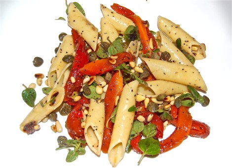 Serves 1 A CookTale Once a week Cathie in her eternal pursuit not to gain weight, has an Artichoke for dinner, (with Mayo?). Rather than involving myself in cooking dinner for one, it gives me a weekly opportunity to enjoy pasta. The fridge held lovely Red Bell Peppers, the garden had fresh Oregano untouched by frost, Anchovies and Pine Nuts were in the pantry, so was a form of Penne with “big quills”, called Pennoni. My dinner was just what I looked forward to. So was Cathie’s. INGREDIENTS 2 Ounces of Penne (use Pennoni if available) METHOD 1. Char the Pepper over a gas burner, turning frequently until the skin is blackened on all sides. Remove to a plastic or paper bag, close tightly & allow to steam until it cools down enough to handle. When it does, rub off the blackened skin, (do not rinse under water). Discard the core & seeds. Cut into 1/4″ wide matchsticks. 2. Heat a small skillet & add the 1/4 cup of EVOO, Anchovies, Pine Nuts & a generous sprinkling of Pepper. Heat until it begins to bubble, then remove & set aside. 3. In a large bowl combine the the Peppers, Capers, & (optional) Garlic. Add the EVOO, Anchovy mixture & gently stir it together to combine. Cover with plastic wrap & allow the Sauce to marinate in the fridge for at least 1 hour. 4. About 15 minutes before serving time, bring a pot of Salted Water to a boil. Add the Pasta & cook (following the time recommended on the box) until al dente. Drain & transfer to a large bowl. Remove the Sauce from the fridge & toss with the Oregano Leaves & Pasta to combine. 5. Adjust the seasonings to your taste, & plate. |