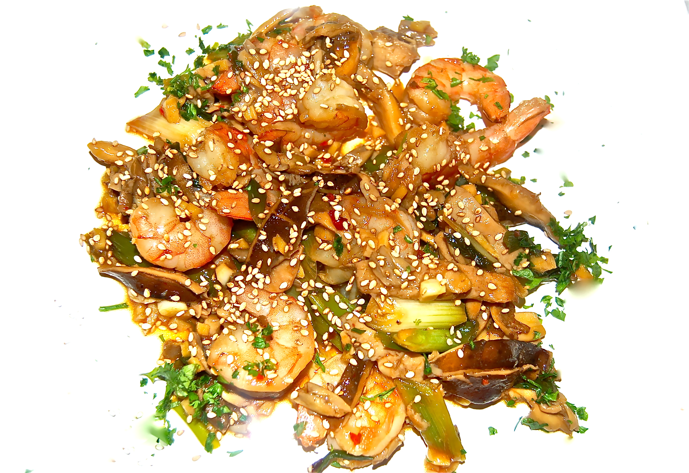 Serves 2 A CookTale Hard to believe, but to those of us who were around, it was forty years ago that Nixon went to China, and Chinese food has never been the same. After that we watched upper Third Avenue in New York City mushroom with restaurants with unusual Chinese names like Hunan, Sichuan, Fujian, Canton. How well I remember our leaving most any one of them with our mouths afire, and darting down to PJ’s at 55th & 3rd to cool them off. (Any reason was a good reason). My versions, with concern for both myself and Cathie, are much people friendlier. INGREDIENTS 1 lb of 16-20 count uncooked Shrimp, (peeled & deveined) METHOD 1. Combine the first 5 ingredients in large bowl & toss thoroughly. Allow to stand for 30 minutes. Combine the Soy Sauce, Chili-Garlic sauce (or Sriracha) & Sugar in small bowl. Combine Chicken Broth & Cornstarch in another small bowl, stir to dissolve. Set aside. 2. Heat the 1 TB of the Peanut Oil in a large wok over medium-high heat. Add the Shiitake Mushrooms & stir-fry until tender & starting to color. Remove to its bowl. Add the Scallions & stir-fry for a few minutes. Add to the Shiitakes. 3. Add another TB of Peanut Oil to the wok, & add the Shrimp. Stir-fry only until shrimp are pink, about a minute. Mix in soy sauce mixture. Return the Scallions & Shiitakes to the wok, add the dissolved Cornstarch. Cook until thickened, about 1 minute. 4. Plate & sprinkle on the chopped Cilantro & Sesame Seeds. |