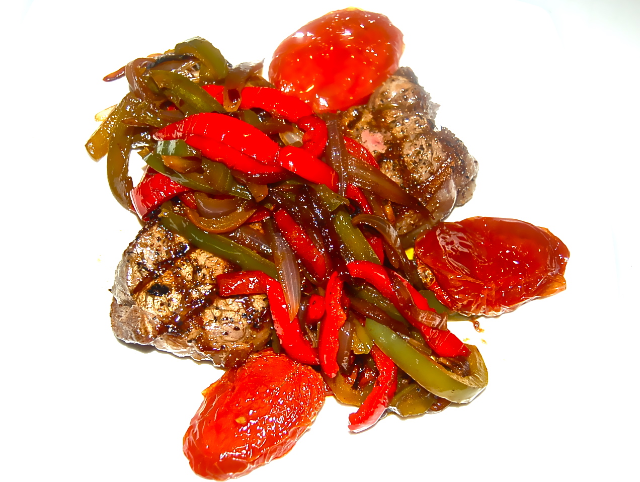 Serves 2 A CookTale This is not a Chinese Pepper Steak recipe, though I do love them that way. This is simply a pan grilled Rib Steak, smothered with Red and Green Bell Peppers and Red Onion. Adding Salt, Pepper and a pinch of Red Pepper Flakes, the flavors blend together beautifully. And the colors blend perfectly with the season. INGREDIENTS 2- 8 oz Rib Steaks METHOD 1. In a large bowl add the prepared Peppers & Onion & add seasonings. 2. In a deep sided saute pan, add the EVOO & the Peppers & Onion. Saute until tender & beginning to take on a color. Set aside & keep warm. 3. Heat a cast iron grill pan to smoking hot. Top the Rib Steaks with a 5 pound cast iron grill press & Grill for 2 minutes a side. The internal temperature should reach 120 degrees for rare. If you require meat less rare, continue grilling, but do not allow the meat to dry out. 4. Add a Rib Steak to each plate & generously cover with Peppers & Onion. Add the Tomato halves & serve. |
