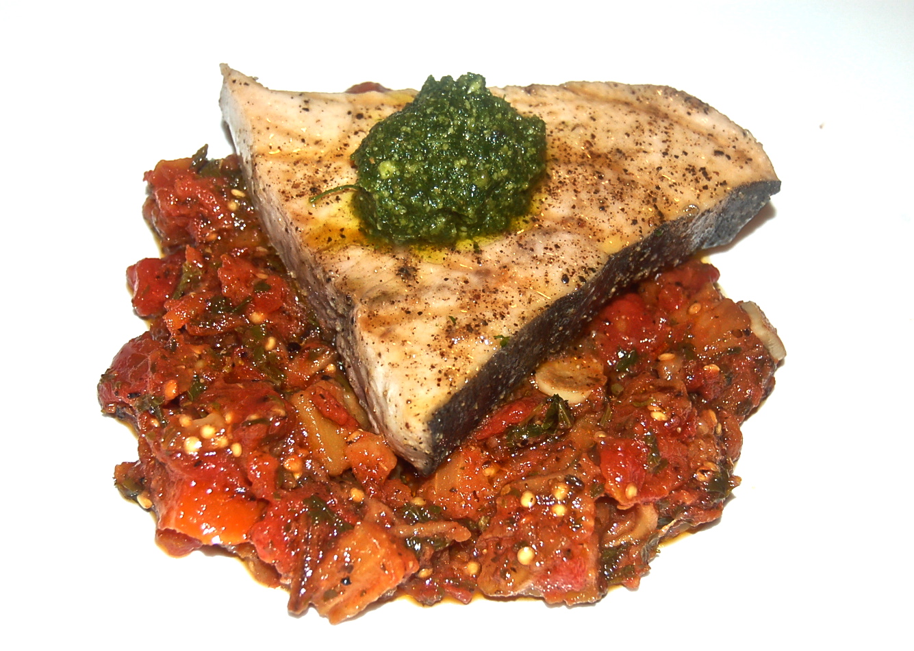 Serves 2A CookTale Sauce alla Norma is an Eggplant and Tomato-based sauce with a glorious history, originated in the city of Catania in Sicily. The most popular version of the story is that it was named after Italian composer Vincent Bellini’s much-loved 1832 opera Norma. Others believe that Bellini’s opera was such an outstanding work, the name Norma simply became associated with what’s wonderful — hence the Norma sauce. INGREDIENTS for Sauce alla Norma 1 large firm Eggplant METHOD 1. Peel the Eggplant & cut it into bite size pieces. 2. Heat a large nonstick saute pan & add 1 TB of EVOO. Fry the Eggplant pieces in two batches, adding extra EVOO as needed. (Eggplants soak up a great amount of EVOO). Toss the Eggplant with the EVOO to coat, then sprinkle with 1 TB of the dried Oregano. Using two spatulas, turn the Eggplant until golden on all sides. Remove to a plate & repeat with the remaining Eggplant. 3. When the second Eggplant pieces have cooked, return the first batch to the pan & add the Red pepper Flakes. Reduce the heat to medium, add more EVOO, the Garlic & half of the chiffonade of Basil, stir together. Add the White Wine Vinegar & the diced Tomatoes. Simmer for 10 to 15 minutes to bring the flavors together. Add the Salt & Pepper & the remaining half of Basil leaves & gently toss the sauce together. RECIPE For Swordfish Steak