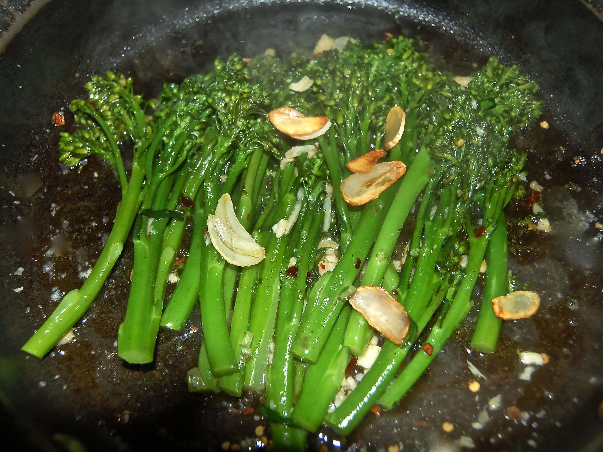 3. In the same skillet, add the minced Garlic & saute until it starts to take on color. Add the Broccolini & 2 TB of Stock or Water & cook stirring for about 5 minutes or until the stalks are tender.