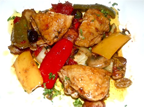 Serves 3 or more A CookTale Last evening I prepared what had to be the zillionth way to cook Sicilian Chicken. This morning I feel as if I was inducted into a world-wide club with over 3,000,000 members. That’s Google’s number of listings just about Sicilian Chicken. I originally was impressed by the recipe in Mario Batali’s 2005 great book, Molto Mario. It’s taken me 6 years to finally prepare it, and with apologies to MB, I made a number additions, changes and variations that suited the way I thought about the dish. Two significant changes was using White Wine in place of Red, and Chicken Thighs only instead of entire Chicken parts. Another change, one that I always rely on, is cooking each ingredient separately, then returning them to the pan together when they’ve all been cooked. INGREDIENTS 4 Chicken Thighs bone-in or boneless (6 oz each, rinsed & patted dry) (they will ultimately be cut in half) METHOD 1. Season the Thighs with Salt & Pepper. In a 12-inch deep saute pan, heat 3 TB of EVOO over medium-high heat until hot but not smoking. Add the Thighs skin side down, brown on both sides, about 5 to 7 minutes per side. Transfer to a plate. Set aside. 2. In same pan, add the Garlic slices & the Potatoes, cook until softened & beginning to brown, about 7 minutes. Remove to its bowl. Add the Mushrooms & another TB of EVOO, saute until tender & lightly colored, Remove to its bowl. 3. Add the Bell Peppers, cook until softened & beginning to brown, about 7 minutes. Remove to its bowl. Add the Celery & Carrots, cook until softened & beginning to brown, about 7 minutes. Remove to its bowl. 4. Add the Eggplant, cook until softened & beginning to brown, about 7 minutes. Remove to its bowl. Add the Tomatoes, Olives, Capers, & Chiles; season with Salt & Pepper. Return all the vegetables & seasonings to the pan. 5. Cut the Thighs in half & add them to the vegetables, Add the Wine, bring to a boil, lower to a simmer, cover, & cook until the Thighs are cooked through, 10 minutes or so. Keep them slightly undercooked, or they’ll be dry instead of juicy. 6. Stir in the Mint, Parsley, & Red Pepper Flakes. Individually plate, & drizzle with EVOO. |