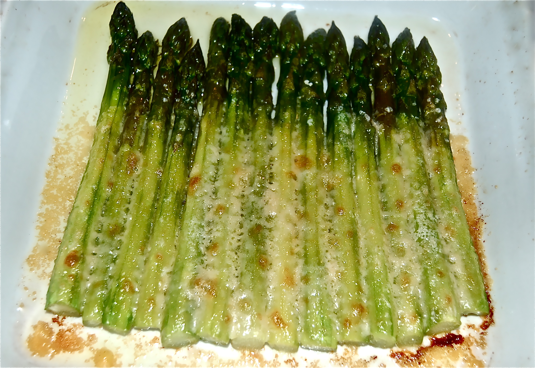 Serves 2 A CookTale The photo says it all. It’s simply par boiled Asparagus, drained, sprinkled with EVOO and coated with Parmesan Cheese. The 425 degree oven does the rest. INGREDIENTS 14 Asparagus stalks (bottoms cut off & peeled) METHOD 1. Preheat the oven to 425 degrees 2. Parboil the Asparagus until the stalks are tender. 4 to 5 minutes. Drain, Dry on paper toweling. Salt & Pepper to taste. 3. Add the Asparagus to an oven proof dish, douse with EVOO & coat with the 1/3 cup of Parmesan. 4. Place in the prepared oven & bake until the Parmesan has completely melted & is starting to brown. 5. Remove & divide to two serving plates. |