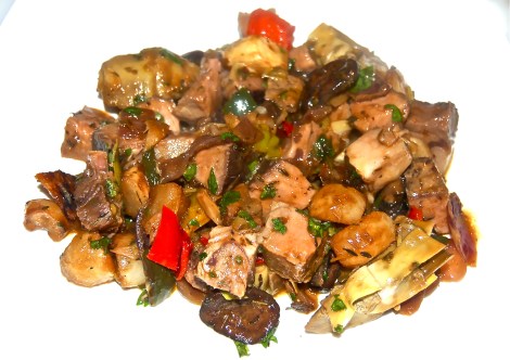 Serves 2 with leftovers A CookTale Here I go again! I just can’t stop making a hash out of leftovers. What was left of past Tuesday’s Rib Roast came to 1-1/2 pounds. It was vacuum packed in our handy Foodsaver and stored in the fridge. Of all the many reasons we love the Foodsaver, not needing to immediately freeze leftovers ranks high on the list. When the package was removed the Beef was as fresh as the day we vacuumed it. The ingredients and my method of preparation doesn’t deviate when working with Beef. It does with Chicken, but that’s another recipe. INGREDIENTS 1-1/2 pounds of leftover Standing Rib Roast (cut to 1″ dice) METHOD 1. Prepare the first 6 ingredients as suggested. Place each in individual bowls. 2. Heat a small sauce pan with 1/3 cup of Water. When it begins to boil, lower the heat to a simmer & add the Demi Glace. Whisk until dissolved to a rich stock & set aside. 3. Heat a large saute pan, add the EVOO & Butter (adding more if required). Saute the vegetables one at a time, as each is cooked, add to a large bowl. Do not cook the Beef Rib, simply add it to the bowl. 4. Replace the entire contents of the bowl to the saute pan, add the enriched stock & gently toss it together. Sprinkle on the chopped Parsley. 5. Ready to plate |