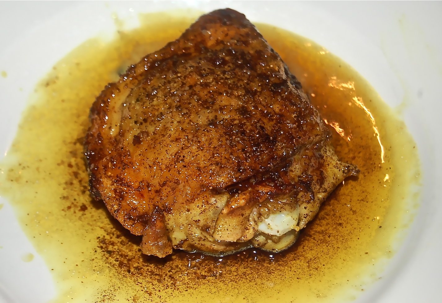 Serves 2 A CookTale Here is a redux of our most favorite way to serve Chicken Thighs, When we’re meated out, we prepare them at least once or twice a month. A mild Curry emulsified with Butter and spread under the skin, does wonders to the dish. As seen in the photo, the sauce is the result of the Curry Butter combining with the natural fat from the Chicken and spooned on and over the Thighs. INGREDIENTS 2 8 oz skin on Chicken Thighs METHOD 1. Mix the Curry Powder & Butter into a smooth emulsion. Carefully lift the Thigh’s skin & with a spatula & coat the meat. 2. Rub any remaining Curry Butter on the skin. Salt & Pepper the Thighs. Set aside. 3. One half hour before dinner, heat the pan, (for this recipe we like the control of an electric pan) to 325F. Add 1TB of Olive Oil & when rippling, add the Thighs, skin side down. 4. Pan fry for about ten minutes & turn the underside down for another ten to twelve minutes. Check the internal temperature, 135F is ideal for Meduium Rare. 5. Remove each Thigh to a plate & spoon the Curry Butter sauce on & around them. L