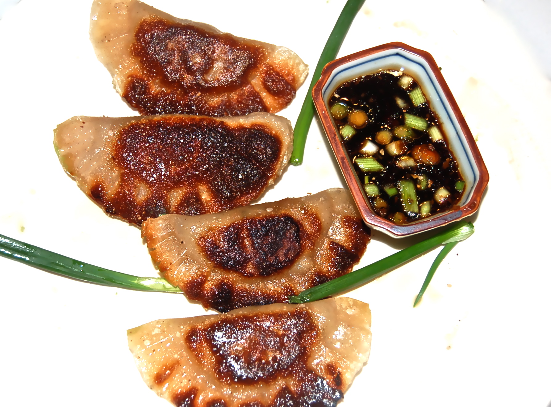 Serves 2 A CookTale I’m far from being unassuming until it comes to making Asian Potstickers and Dumplings. It is and always has been my challenge. Though every supermarket now has a self-service dumpling center, for some unexplainable reason I opt to make my own. The results are generally spotty, the satisfaction always gratifying. And evidently that’s what keeps dragging me back. INGREDIENTS 1/2 lb of ground Pork METHOD 1. In a food processor, add the first 8 ingredients. 2. With your fingers, wet all sides of the Gyoza wrapper. 3. Boil a large pot of water. Add 1 TB of Peanut Oil & reduce to a simmer for about 5 minutes or until the potstickers rise to the surface. Drain on paper towels & repeat with as many as desired. 4. In a non-stick fry pan, heat 1 TB of oil & carefully fry the potstickers until browned to your preference. SOY GINGER SAUCE Stir together: 2 TB of Soy Sauce Garnish the plate with slices of Scallions |