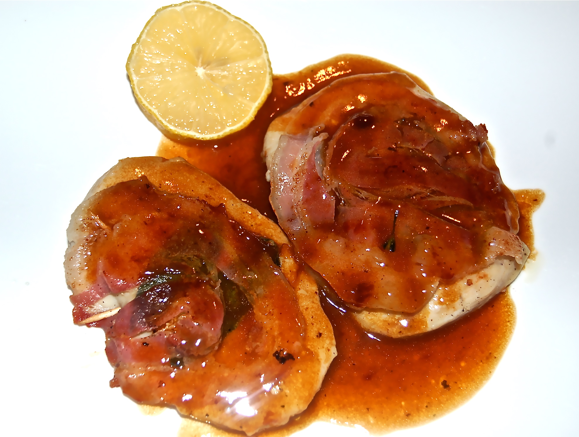 Serves 2 A CookTale For unrecorded years the dish called Saltimbocco was and still is classic throughout Italy, Switzerland, and Southern European countries. Saltimbocco translates to “jumps in the mouth”. Traditionally the meat is Veal, pounded with a mallet as thinly as possible. My version using Chicken, was treated similarly. That’s where the comparison ended. The reason, I believe is that Veal takes seconds for each side to brown and tenderize, whereas Chicken takes minutes, and that extra time in a hot pan caused them to seize up. At least mine did. They looked good, Were tasty, but the Chicken Breast can never be as tender as a top round of Veal. Lesson learned was stick to the classic, so the recipe is for Veal. INGREDIENTS 4 3 oz. slices of top round of Veal (pounded thinly to an even thickness) METHOD 1. Season the Veal cutlets with Salt & Pepper. Pound them with a meat mallet as thin as possible. To each slice, add two Sage leaves & top with a slice of Pancetta or Prosciutto. Set aside. 2. In a large deep-sided saute pan over medium-high heat, melt the 2 TB of Butter with the EVOO until very hot. Add the four cutlets, Pancetta or Prosciutto side down, for 1 minute. Turn the cutlets & cook briefly for 1 minute more. 3. Remove them to a platter & cover with foil while the sauce is being prepared. Turn up the heat, & when the pan is sizzling, add the Wine & deglaze the pan, stirring to scrape up any browned bits stuck on the pan bottom. Boil until reduced to 1/4 cup, about 3 minutes. Remove from the heat & whisk in the remaining 1 TB of Butter. 4. Spoon an equal amount of the Butter/Wine Sauce onto each plate, Add a drizzle of the Sauce over each cutlet. Serve immediately. |