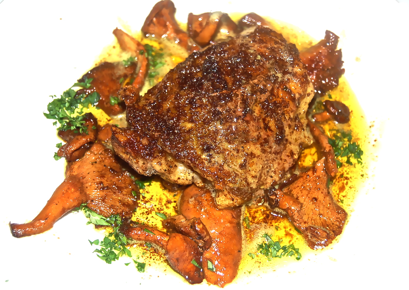 Serves 2 A CookTale Here is yet another redux on how we prepare and serve Chicken Thighs. Their on the table at least once or twice a month, especially when we’re meated out. A mild Curry powder emulsified with Butter and spread under the skin, does wonders to the dish. As seen in the photo, the sauce is the result of the Curry Butter combining with the natural fat from the Chicken and spooned on and over the Thighs. The saute of Chanterelles that were added were ones we did’nt use the other evening. They were kept fresh by keeping them lightly covered with damp paper toweling in the fridge. Chanterelles or any other wild mushroom is a delicious option. INGREDIENTS 2 8 oz skin on Chicken Thighs METHOD 1. Mix the Curry Powder & Butter into a smooth emulsion. Carefully lift the Thigh’s skin & with a spatula & coat the meat. 2. Rub any remaining Curry Butter on the skin. Salt & Pepper the Thighs. Set aside. 3. One half hour before dinner, heat the pan, (for this recipe we like the control of an electric pan) to 325F. Add 1TB of Olive Oil & when rippling, add the Thighs, skin side down. 4. Pan fry for about ten minutes & turn the underside down for another ten to twelve minutes. Check the internal temperature, 135F is ideal for Meduium Rare. 5. Remove each Thigh to a plate & spoon the Curry Butter sauce on & around them. Add the optional Mushrooms. |