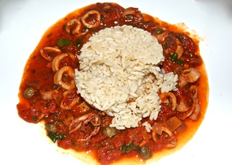 Back on January 15th, I posted a Calamari and Octopus Stew, and it was a tasty dinner. A month almost to the day and it was time to once again enjoy a seafood stew. This time in honor of Valentine’s eve it was made only with Calamari rings. Simple to prepare, a one-pot dinner, and less clean-up. Even the Rice was prepared in an electric ricer. That makes for a win-win all around.