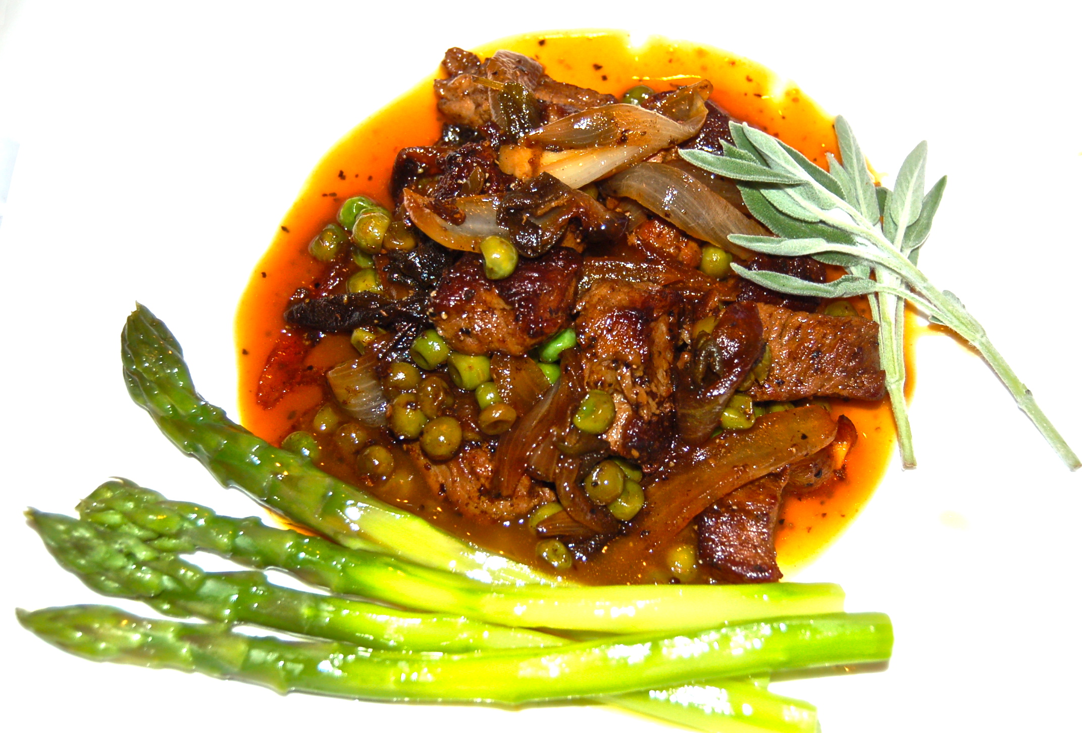3. Uncover, add the Peas, raise the heat to medium. Cook for about 5 minutes, until the Peas are done. Adjust seasoning, nap the plate with a White Wine Reduction sauce (optional), garnish if you like & serve.Spring Veal Stew Garnished and Plated