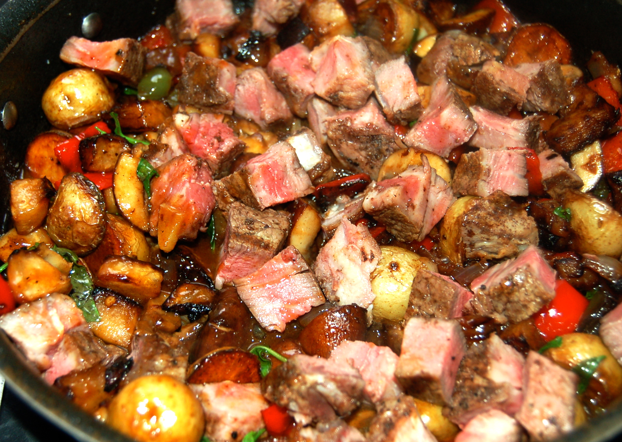 What remained from Saturday’s great Porterhouse was what some consider the finest part of the steak, the fillet. It weighed 8 ounces, just enough to add to an assembly of sauteed vegetables into what is for some unknown reason called Hash. Most often, be it beef, lamb, or chicken, leftovers turned into the next evening’s Hash is a dinner we look forward to, as we surely did last evening. With the assortment of fresh vegetables, it is a splendid one plate dinner.