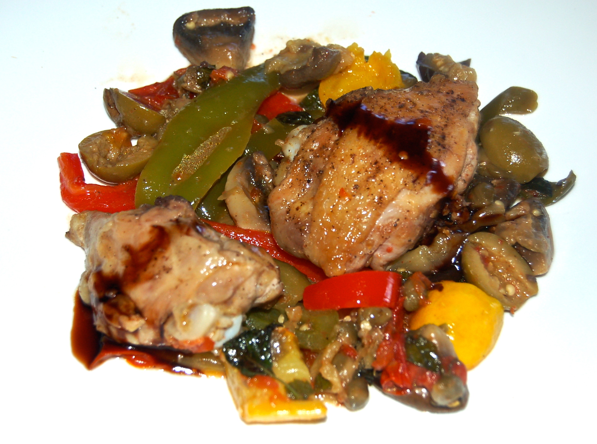 1. Season the Thigh pieces with Salt & Pepper. In a 10- to 12-inch saute pan, heat 2 TB of EVOO over medium-high heat until hot but not smoking. Add Chicken pieces skin side down; brown on both sides, about 5 minutes per side. Transfer to a plate. Set aside.