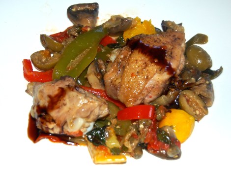 2. In same pan, combine Mushrooms, Peppers, Celery, Eggplant, Tomatoes, Olives, Capers & Chiles. Cook until softened but not browned, about 5 minutes. Season with Salt & Pepper. Add both the Wine & Marsala, return Chicken to pan, & bring to a boil. Lower heat to simmer, cover; cook until the Chicken is cooked through, about 15 minutes.