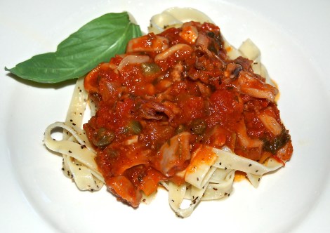 3. Add the Calamari to the sauce. Continue to slowly simmer for about another 45 minutes, stirring occasionally. Test for tenderness — the Calamari should be tender & the sauce very savory. Add the Capers & the chopped Parsley, combine it all, & it’s ready to sit atop the bed of Fettuccine.