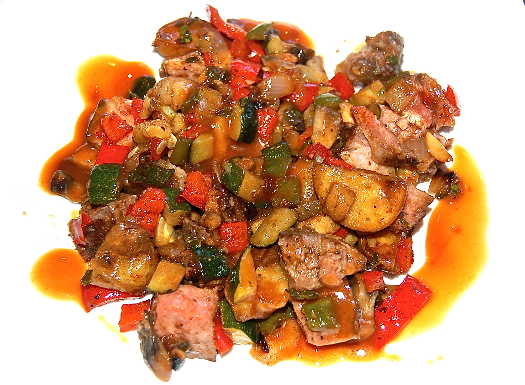 3. Heat a large saute pan, add the EVOO & Butter (adding more if required). Saute the Vegetables one at a time, as each is cooked, add to a large bowl. Do not cook the Rib Eye, but add it to the bowl.