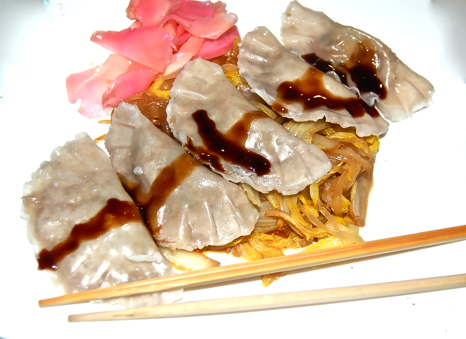Serves 2 A CookTale I’m far from being unassuming until it comes to making Asian Potstickers and Dumplings. It is and always has been my challenge. Though every supermarket now has a self-service dumpling center, for some unexplainable reason I opt to make my own. The results are generally spotty, the satisfaction always gratifying. And evidently that’s what keeps dragging me back. INGREDIENTS 1/2 lb of ground Pork METHOD 1. In a food processor, add the first 8 ingredients. 2. With your fingers, wet all sides of the Gyoza wrapper. 3. Boil a large pot of water. Add 1 TB of Peanut Oil & reduce to a simmer for about 5 minutes or until the potstickers rise to the surface. Drain on paper towels & repeat with as many as desired. 4. In a non-stick fry pan, heat 1 TB of oil & carefully fry the potstickers until browned to your preference. SOY GINGER SAUCE Stir together: 2 TB of Soy Sauce Garnish the plate with slices of Scallions |