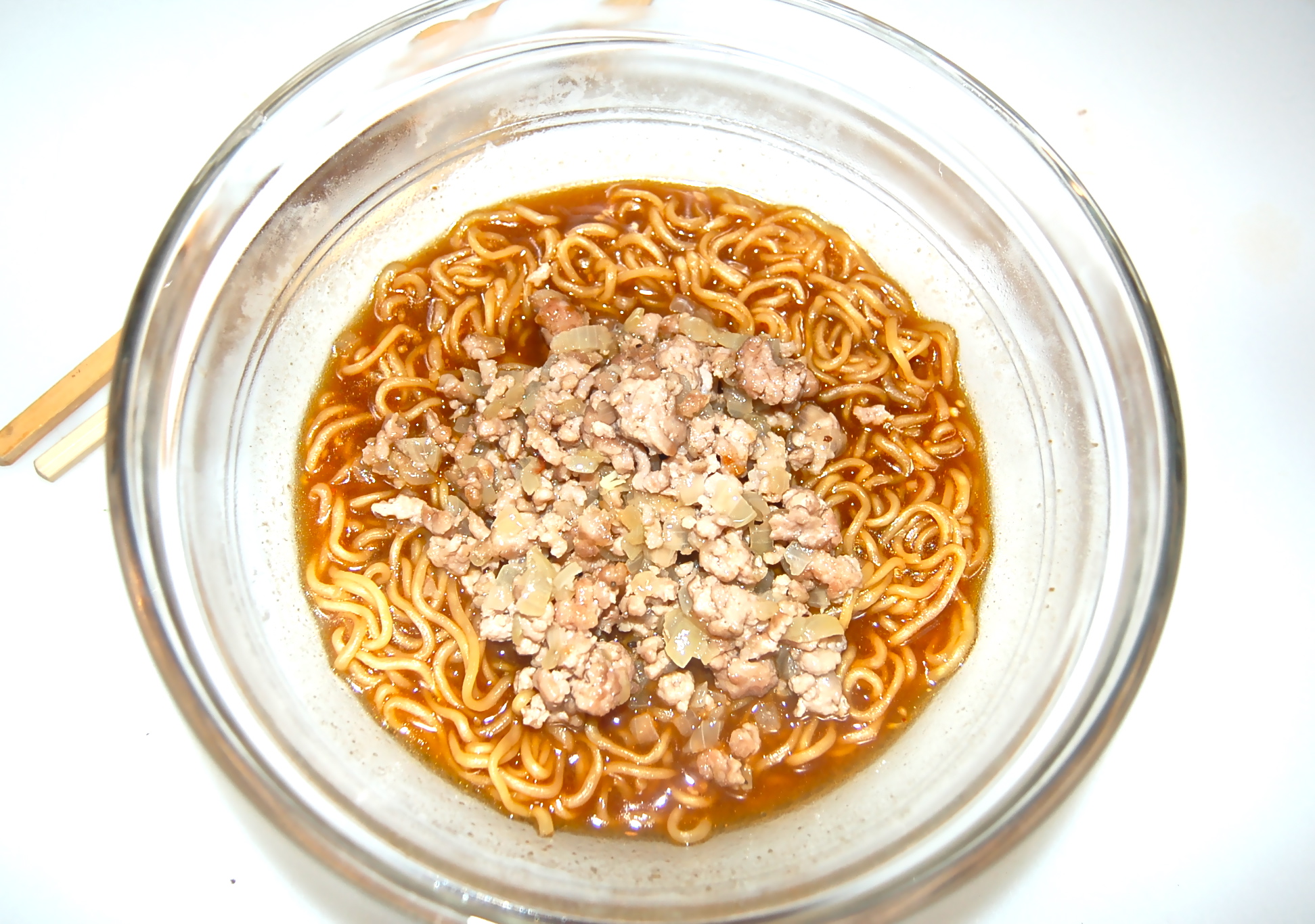 3. To serve, transfer the noodles to a deep bowl, & top with the Pork & Onion mixture.