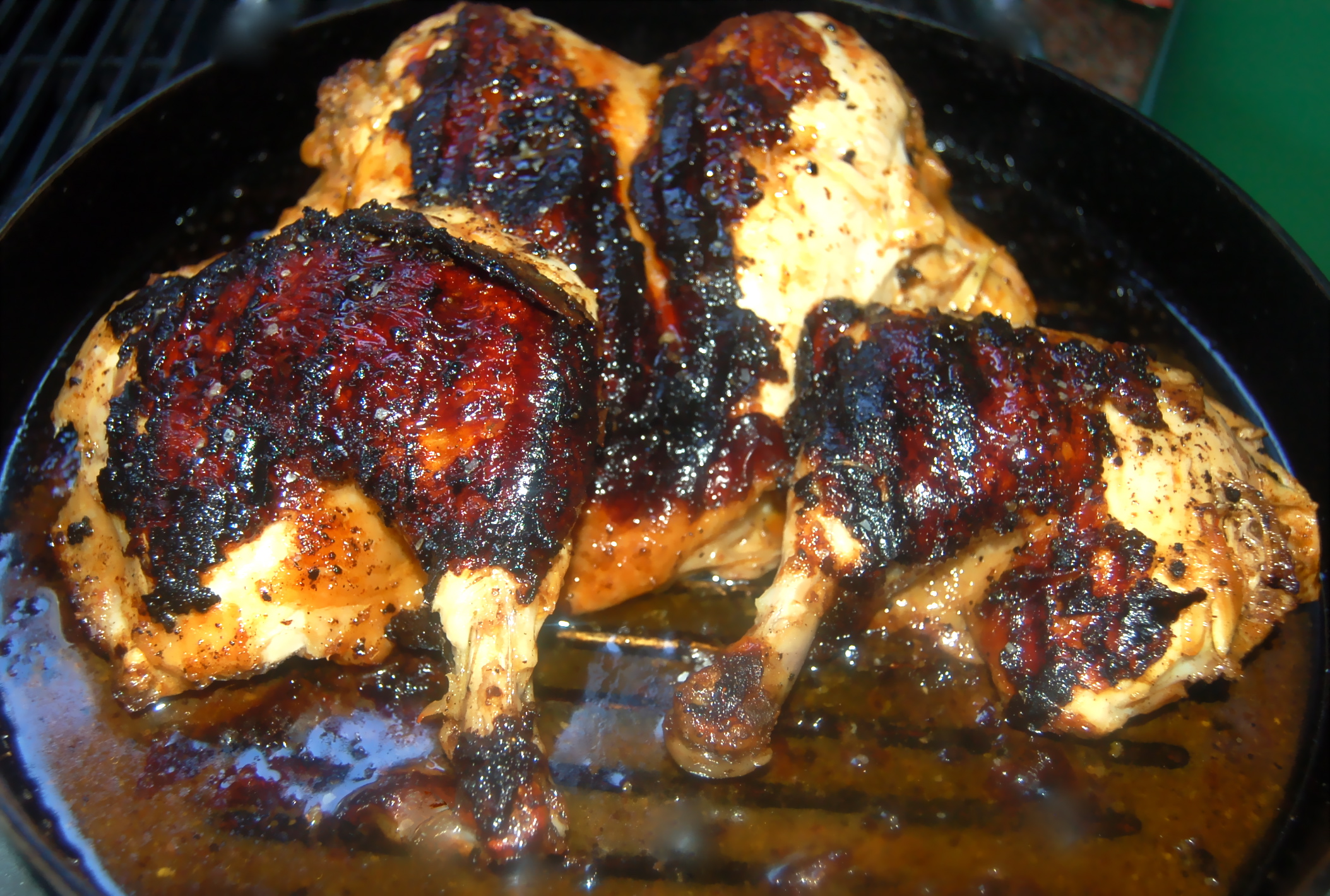 3. Heat a stove top non stick grill pan or an outdoor gas or charcoaL grill until very hot. Place the Chicken skin side down & cover with two bricks wrapped in foil or a commercial grill press. Grill for ten minutes. If using an indoor grill pan, turn the Chicken over & place in an oven heated to 350 degrees, for about 15 minutes.