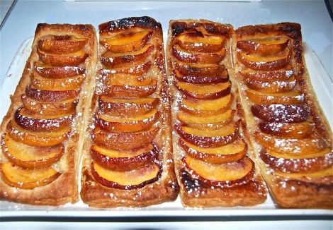 A CookTale In this kitchen dessert is a constant challenge. We are not big dessert fans. The exception, of course, is dinner parties, and there too, I opt for the easy way out. Prepared Puff Pastry, available almost everywhere, is my panacea, be it a sweet fruit tart or a savory vegetable tart. The ability to create taste worthy dishes are boundless and impressive. INGREDIENTS 1 Sheet of frozen Puff Pastry dough (thawed for 20 minutes) METHOD 1. Place the thawed Puff Pastry on a floured baking sheet, unfold the Puff Pastry & roll it to a 8″ X 12″ rectangle. Working quickly, & keeping the Puff Pastry well floured, cut it into four 3″ X 8″ pieces. Place in the fridge for 10 minutes. 3. Slice the Peaches (skin on or removed) into a small bowl & add the Lemon Juice & Sugar. Carefully place the slices of Peaches overlapping down the center of each Pastry rectangle, leaving a 1/2″-inch border around the edges. Dot the top of the peaches with the Butter. Sprinkle the Puff Pastry & the Peaches with the reserved 1 TB of Sugar. 3. Place the rack in the center & preheat the oven to 400°F. Add the baking sheet & bake the Puff Pastry Tarts for 15 minutes, or until puffy & well browned. 4. Remove & allow to cool. Sprinkle with Powdered Sugar & prepare to plate. 5. Serve with Whipped Cream or Ice Cream. |