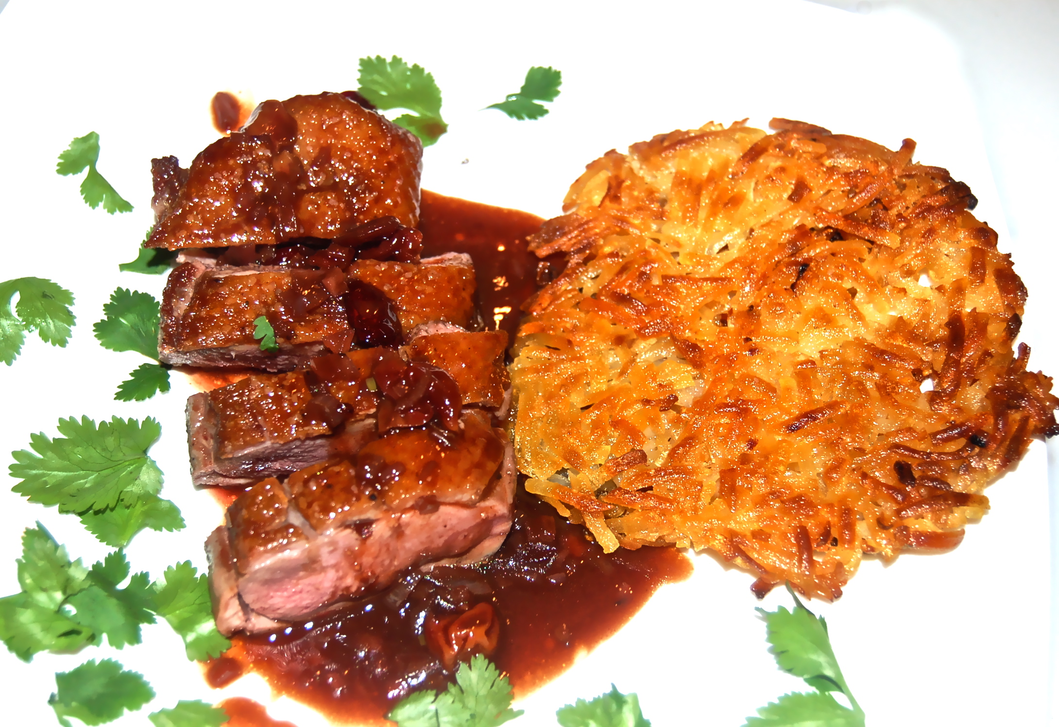 February 2, 2012 Duck Breast With Cranberry Cherry Sauce & Hash Browns
