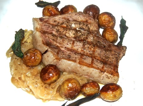 A CookTale Tucked away in the hamlet of Preston Hollow, NY is a remarkable farm that features all things country, especially products of extraordinary quality from grass fed livestock. It’s a small journey from Woodstock and a delightful drive. A phone call to Carol Clement at 518-239-6234 and your order can be awaiting you at the Winter Saugerties Farmers’ Market. And it’s always as wonderful as can be. INGREDIENTS 2 1-1/3 Pound of Grass Fed Pork Rib Chops, 1-1/4″ thick METHOD Here is a technique that insures that your Pork will not seize up during cooking. 1. Heat a cast iron grill pan to smoking. 2. Apply the seasonings & a TB of EVOO. 3. Sear the Pork Chops, weighted down with a grill press for 1 minute, turn both diagonally & repeated for another minute. Remove to a platter & tent with foil to keep warm. 4. In a deep sided saute pan add the second TB of EVOO. Add the Onions & Fennel & saute them until tender & lightly browned. 5. Return the Pork Chops to the pan. Add the Apple Juice, just enough to reach half way up the Chops. 6. Cover & braise the Chops for no more than 20 to 25 minutes. You really don’t want the Pork to be cooked beyond the rare to medium rare stage. Well done does only one thing to Pork, destroy it. 5. Spoon a generous portion of the Onion Fennel mixture on each plate. Top with a Pork Chop. Add the Oven roasted Baby Potatoes to flank the Pork Chops. 6. Finally, scatter the fried Sage leaves & serve. |