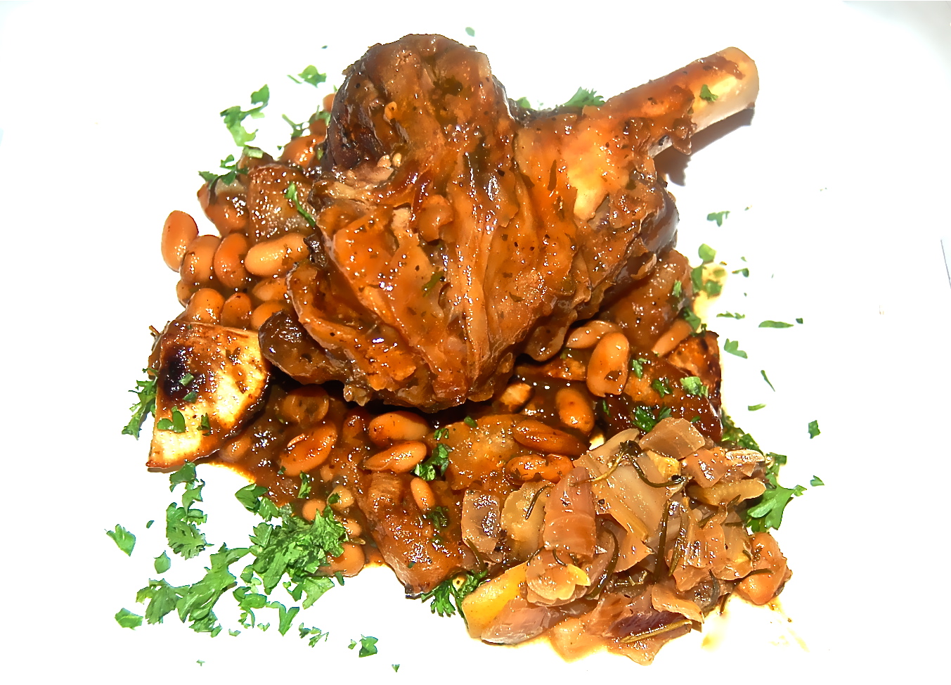 Serves 2 A CookTale As Cathie picks up her pace, I’m able to pick up mine. Last evening’s dinner, an adaptation from the New York Times by Florence Fabricant, was an example of a recipe with many components, and a far cry from the past two weeks of Broccoli, Apple Juice or a few ounces of Pasta. INGREDIENTS 1 Can of Cannellini Beans * available by “More Than Gourmet” on-line from Amazon METHOD 1. Heat 2 TB of EVOO on medium-high in a 4-quart stovetop casserole. Season the Lamb Shanks liberally with Salt & Pepper, add to the casserole & sear to a deep color, about 15 minutes Remove to a platter. Add the prepared Turnips, brown lightly until beginning to tenderize. Remove to a bowl. 2. Reduce the heat to low. Add the chopped Leeks & sliced Garlic, sauté until softened. Stir in the Lemon peel, Rosemary & the Wine. Return the Lamb Shanks to the casserole, cover & simmer on low heat for 1 hour. 3. While meat cooks, add the canned Beans & their broth to a saucepan, bring to a simmer, cover & cook for 10 minutes on low. Turn off the heat & set the sauce pan aside. 4. After 1 hour, the Lamb should begin to tenderize. Remove them to a platter, leaving all liquid in the casserole. Drain the Beans & add to the casserole. along with the Turnips, the 1- 1/2 cups of stock & the (optional) Demi Glace. Season with Salt & Pepper. Bring to a simmer. Tuck in the Lamb, cover & cook on low 30 to 45 minutes, until all the ingredients in the casserole are very tender. 5. Transfer to plates, garnished with Rosemary branches & an additional spoonful of the sauce & serve. |