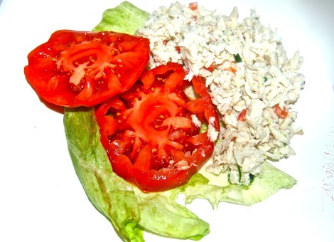 2. Arrange a layer of Lettuce leaves on two plates. Place the Crabmeat mixture in a mound atop the Lettuce & add the sliced Tomatoes. Serve.
