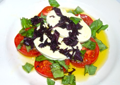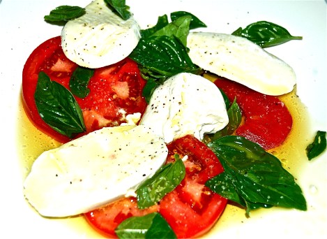 A Salad for dinner, and you leave the table very satisfied. That’s the beauty of ripe local Tomatoes, fresh Basil and two types of Mozzarella. One was imported Buratta, all topped with a fruity Extra Virgin Olive Oil. And if you get on the scale the next morning your body will shout a vote of thanks.