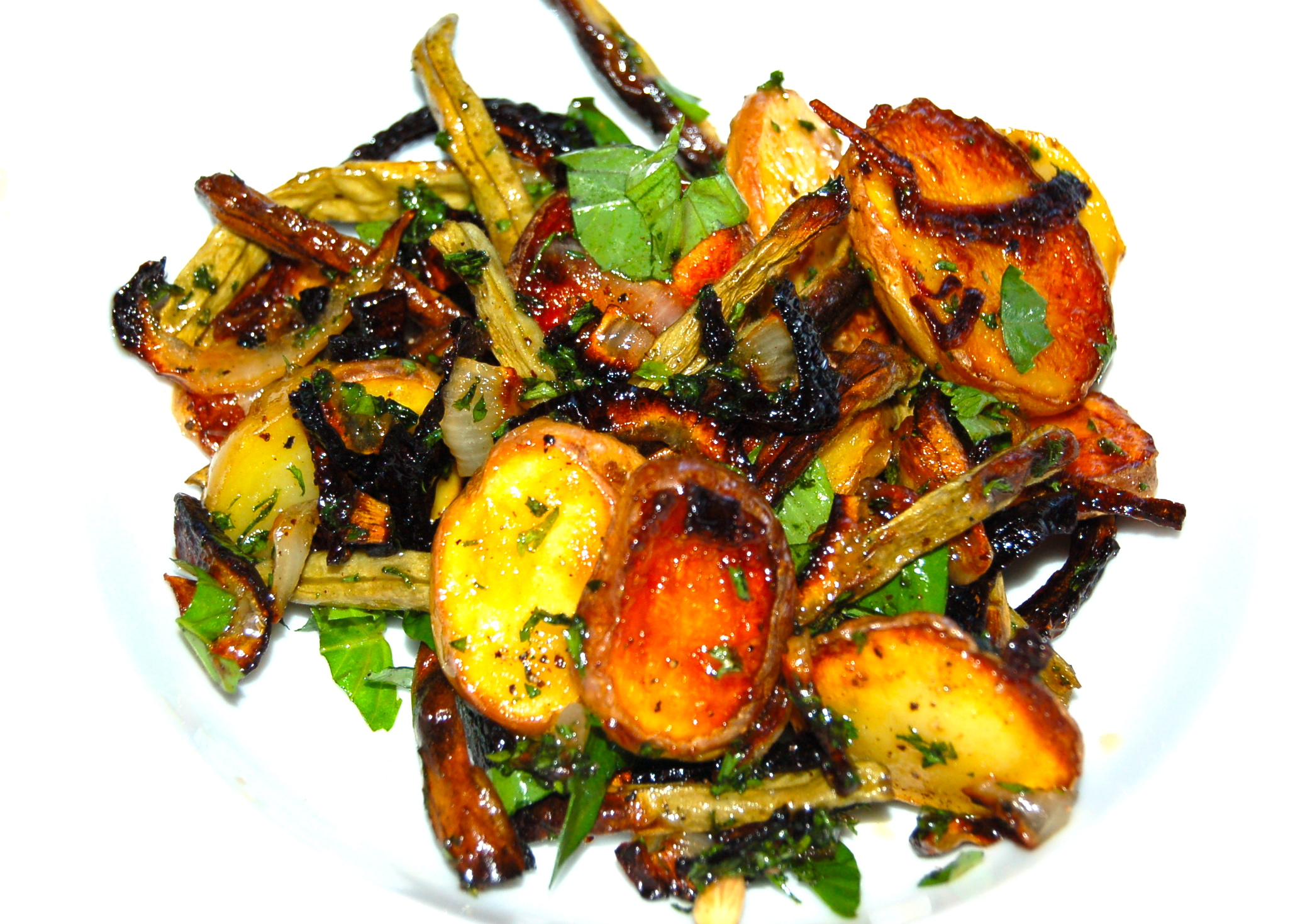 3. While the roasted Vegetables are still warm, drizzle them with the Honey & Lemon juice, sprinkle with the Parsley & Basil & toss to coat. Taste, & add Salt and/or Pepper as needed.