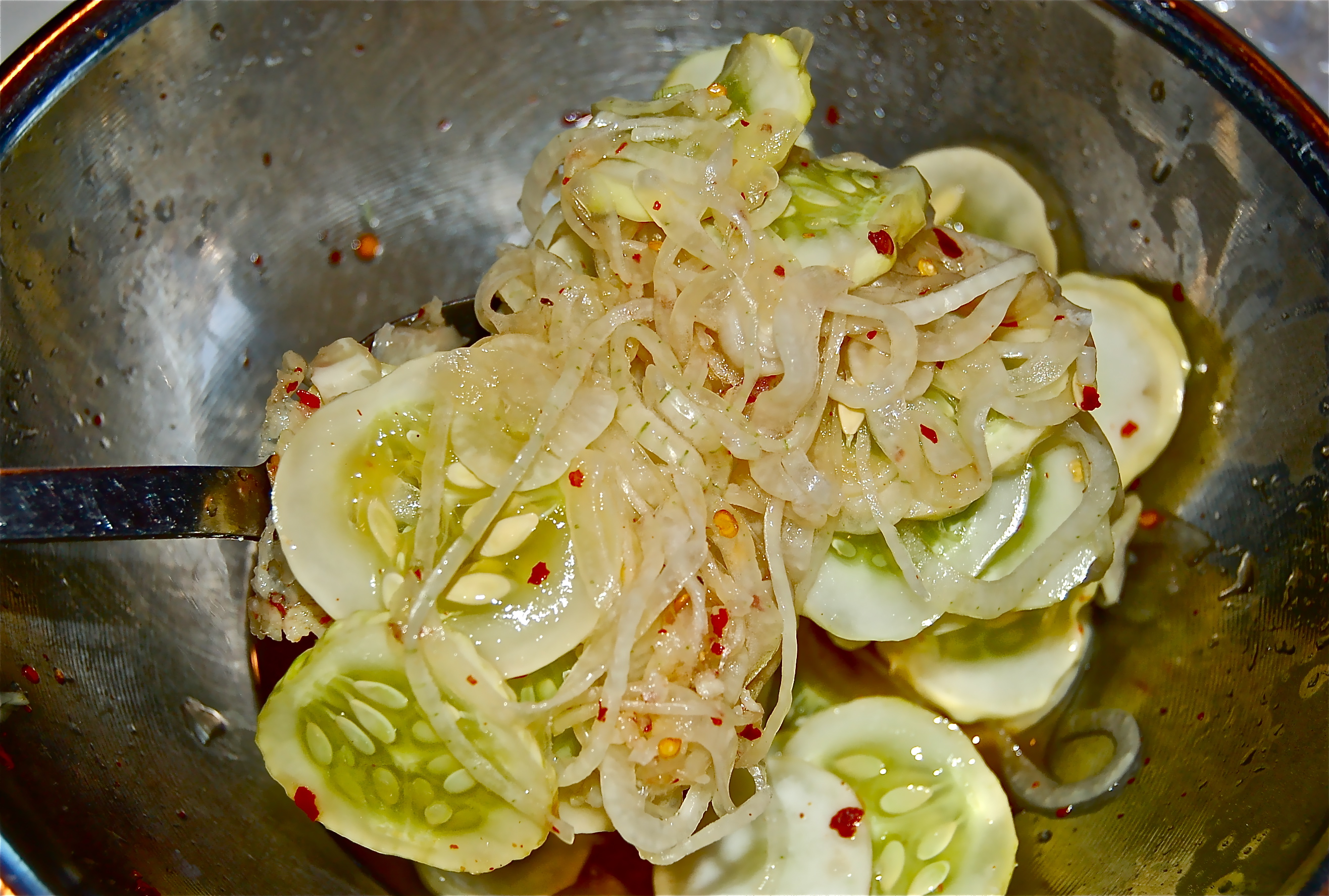 An Adaptation from the New York Times of a recipe by Hooni Kim of the Danji Restaurant in New York A CookTale When I come across a Kimchi recipe, my eyes open wide. The classic method calls for Cabbage cut into a slaw. Here it was made with Cucumbers from our garden, which has yielded a bounty crop of Market Mores and Lemon Cucumbers. The result was a less “violent” Kimchi. I suppose you could add more hot pepper, but I don’t know why. This version is delicious. INGREDIENTS 3 small Cucumbers, cut into 1/8-inch slices METHOD 1. Place the Cucumbers in a medium-size bowl, then sprinkle with the Salt. Let stand 20 minutes. 2. Rinse the Cucumbers in cold water to remove Salt, drain & dry with paper towels. 3. Return Cucumbers to bowl, add the Onion & all the other ingredients, toss to combine. 4. Cover tightly and place in refrigerator overnight or until ready to use. |