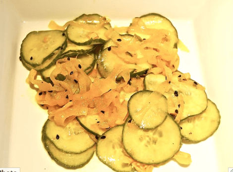 1/2 cup Rice Vinegar or 1/2 cup White Vinegar diluted with 1/4 cup Water 2-inch piece of fresh Ginger, peeled and minced or grate 2 tsp Sugar 1 tep Salt 3 TB of grapeseed or other neutral oil 1 medium to large Onion, thinly sliced 1/2 teaspoon ground Turmeric, optional but necessary 2 TB of sesame seeds. METHOD 1. With Asian or English cucumbers (or small garden cucumbers), slice thinly, preferably with a mandoline. With thick cucumbers, peel, halve lengthwise, and scoop out seeds before slicing. L