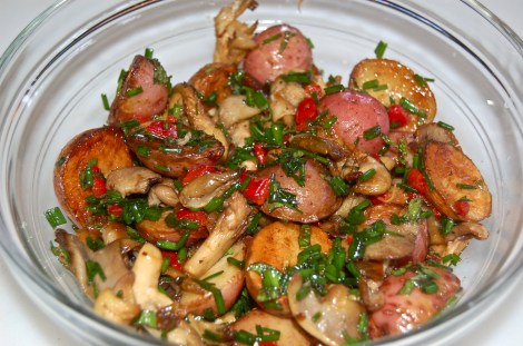 Cath asked for a side of Sauerkraut to accompany the Weisswurst, I made a face & disagreed, Sauerkraut! Then I thought about an alternative, searching around I realized we had baby potatoes & fresh oyster mushrooms, & the herb garden was ablaze with flowering chives. Aha! I steamed the potatoes, cleaned & separated the oyster mushrooms & heated a saute pan to high. Added olive oil & in two separate batches & sautéed the ingredients. When they were beautifully browned, they were added to a large mixing bowl. I grabbed a scissor & lumbered to the herb garden & attacked the chives.