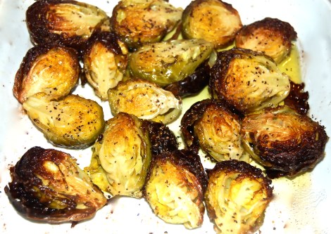 2. Halve the Brussels & add to a large bowl. Douse with the EVOO & sprinkle with Salt & Pepper.